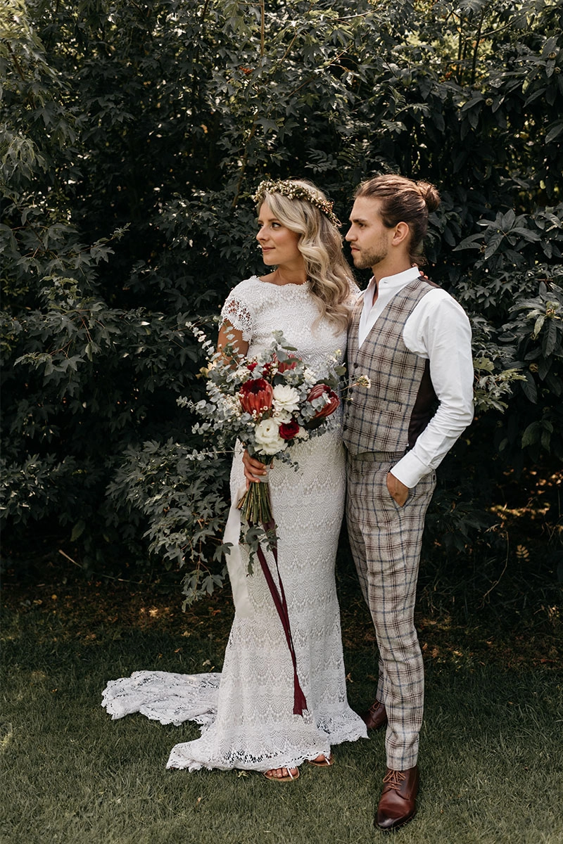 Wat betreft de stofkeuze heb je verschillende mogelijkheden. Wanneer je in de winter trouwt kun je bijvoorbeeld kiezen voor een volle, wollen stof, zoals flannel of tweed. Deze stoffen zijn warm en hebben een vintage look. Als je in de zomer het jawoord geeft dan kun je prima kiezen voor een linnen pak. Linnen is een luchtige stof, die er wat grover uitziet en een natuurlijke structuur in zich heeft. De perfecte stof voor een zomerse vintage wedding. Als jij geen fan bent van linnen, kies dan voor een blend met wol om de kreuk te verminderen of kies voor een 100% katoenen pak. Doordat katoen ook een matte stof is past dit perfect bij het thema.
