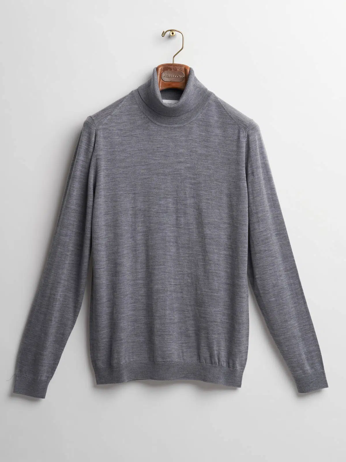 Deze grijze merinowollen coltrui is een essentieel item in iedere herengarderobe. De trui is zowel met een jeans te combineren als met een tweedelig pak of overshirt. Zo kun je met dit item zowel een formele als een casual outfit samenstellen. De meroniwollen stof staat luxe uit en is bijzonder elegant.