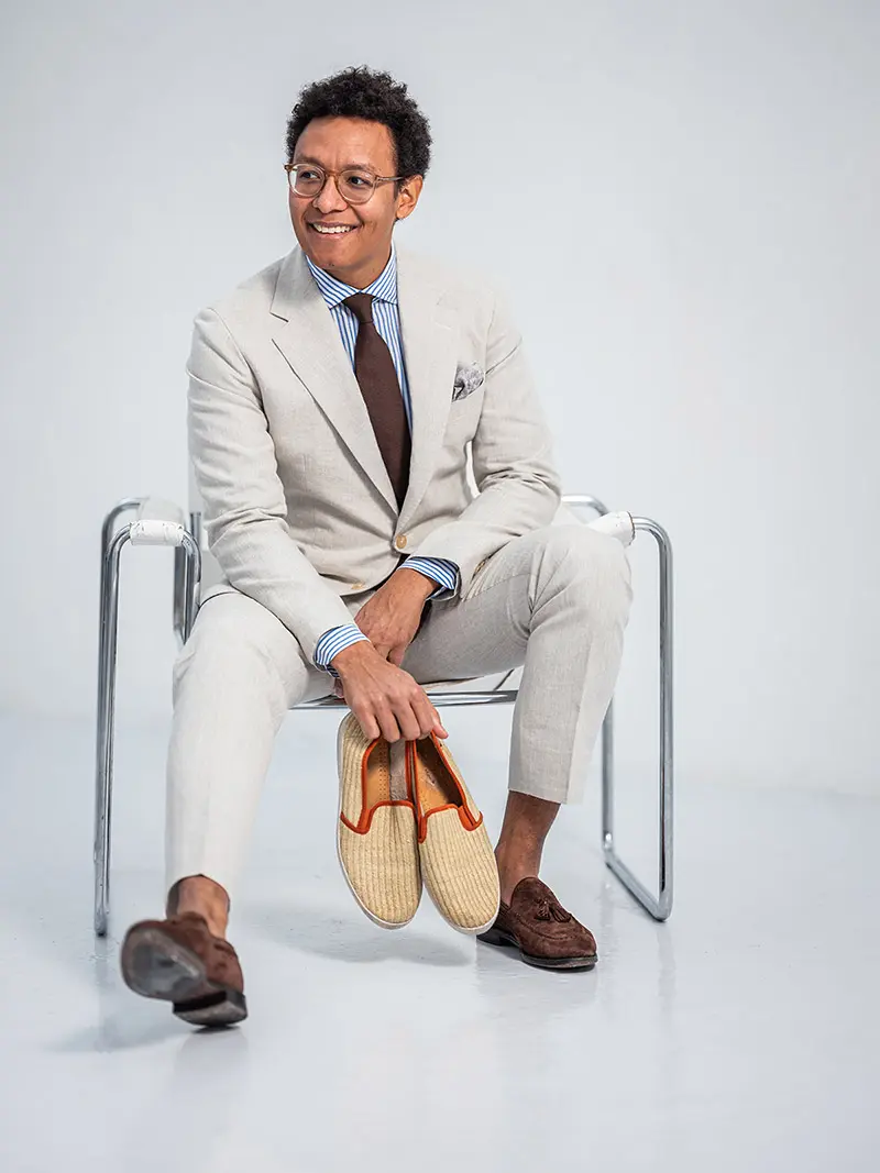 “Deze instappers zijn van het merk Rivieras. Ik zei net dat ik niet merkentrouw ben, maar als het om deze schoenen gaat dus wel. Ik ben ooit in München voor het eerst in een zaak geweest waar ze dit merk verkochten. Daar heb ik mijn eerste paar gekocht. Ze lopen heel lekker en het zijn ontzettend opvallende ontwerpen. Je hebt ze in een stuk of tachtig verschillende uitvoeringen en er komen ieder jaar weer nieuwe ontwerpen bij. Ieder voorjaar koop ik weer twee of drie paar, omdat ik ze zo mooi vind. Ik heb vijfentwintig paar in letterlijk alle kleuren thuis. Ze zijn inmiddels typerend voor mij. Mijn vrienden zeggen ook altijd: ‘Het is weer zomer, want Yung heeft zijn Rivieras weer aan!”
