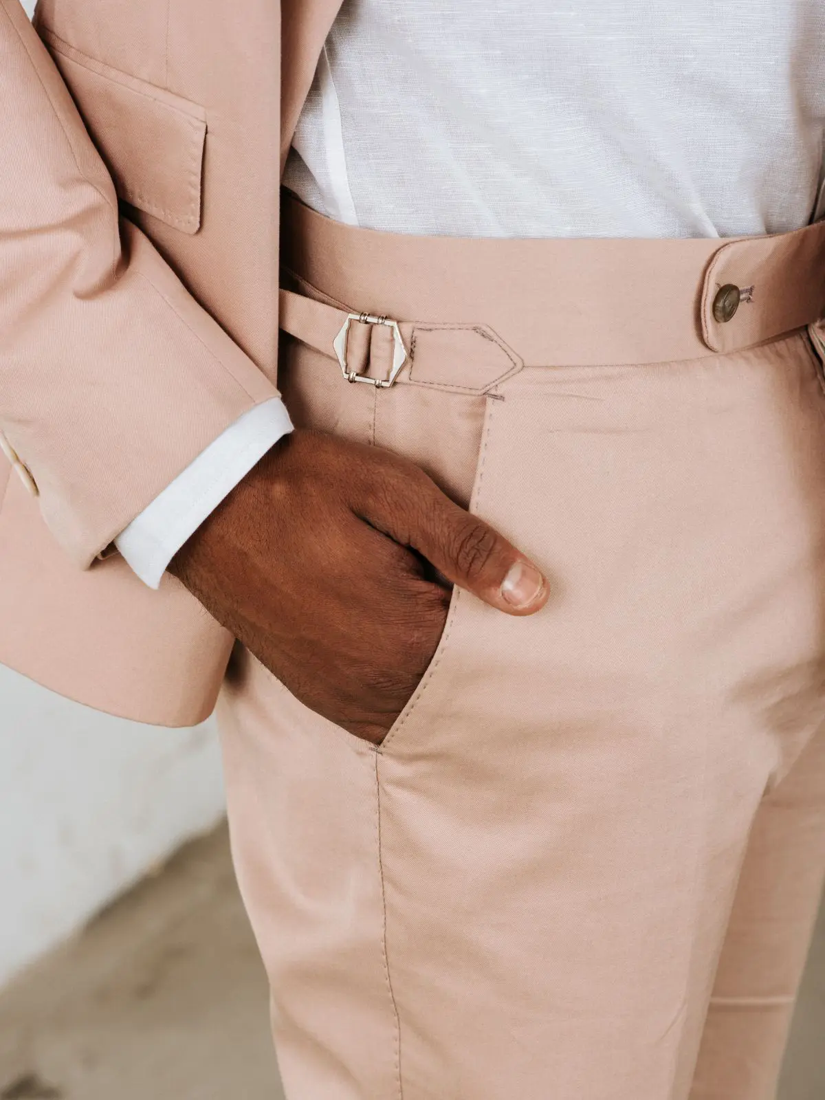 Katoen is een zeer ademende stof met een lichte stretch. Een katoenen pak draagt vooral in de zomer erg prettig. In deze serie is gekozen voor verschillende pastel tinten. Deze zijn gemakkelijk te combineren met aardetinten, wit en de harde kleur variant van de pasteltint. De pantalon is zowel gekleed met jasje te dragen, als enkel met een overhemd voor een sportieve zomerse look.