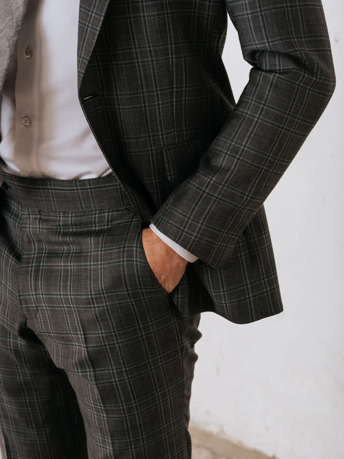 Een klassiek business pak passend bij de huidige trends, dankzij de groen gekleurde ruit in de stof. De combinatie van de rustige grijstint met het opvallende groen zorgt voor een moderne twist.
