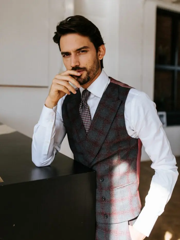 Deze stof is een bijzonder mooie combinatie van ‘s werelds beste wolsoorten en zacht zijde. Het zijde zorgt voor een lichte glans waardoor de outfit zijn luxe uitstraling verkrijgt. De donkere ruit en double breasted gilet geven dit pak een opvallend karakter, door de verfijndheid in de stof behoudt dit pak wel zijn elegante uitstraling.