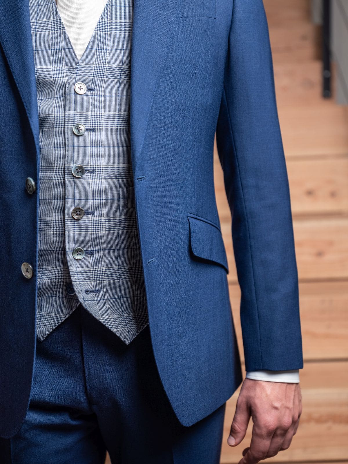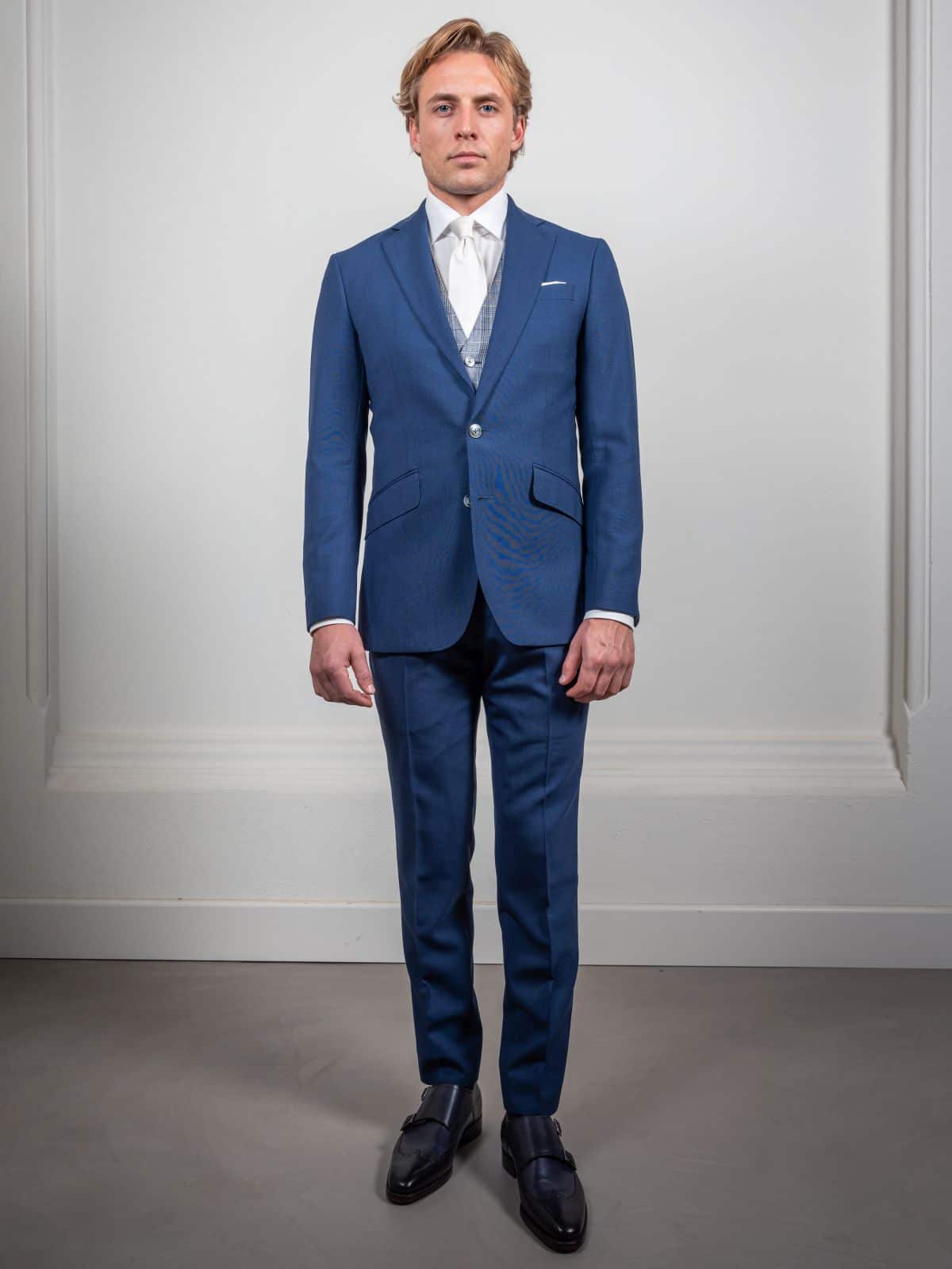 De wollen stof waarmee trouwpak Blend gemaakt is heeft een natuurlijke stretch, waardoor het de gehele dag comfortabel draag. Door het pak te combineren met een contrasterend vest ontstaat er een feestelijk geheel, welke ook stand houdt wanneer je het jasje niet draagt.