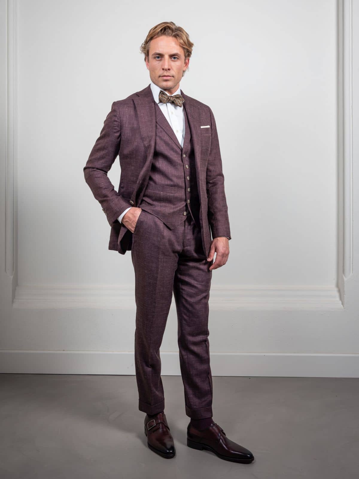 De kleur maroon gaan we gegarandeerd veel zien komend jaar. Het driedelige pak leent zich uitstekend voor een klassieke look. Wil jij je liever iets sportiever kleden? Dan kan het pak ook goed zonder jasje dragen worden, zoals afgebeeld in de styled shoot.