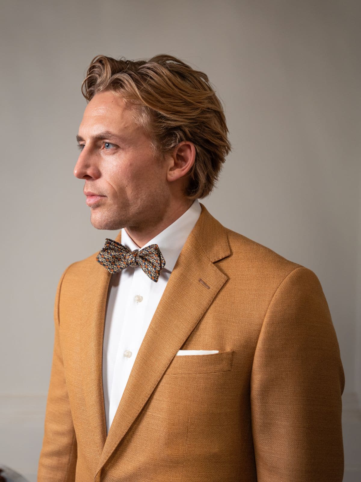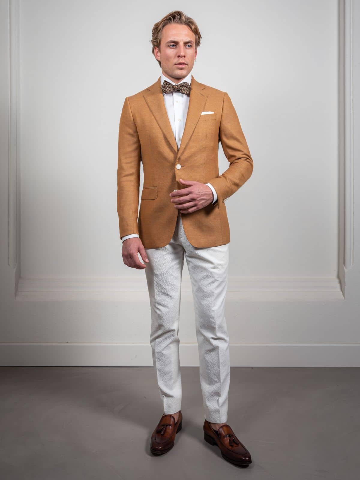 Trouwpak Oker is een zomers, speels en comfortabel trouwpak voor de moderne bruidegom. We hebben de okertint gecombineerd met cognac bruine loafers en een handgemaakte zijden strik, dit maakt de outfit zeer feestelijk. De kleur staat veel mannen goed, maar laat je altijd adviseren door je tailor.